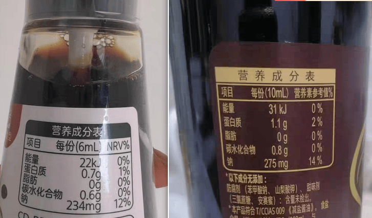 产物消息显示,这款“海天”松茸特级酱油次要成分顺次是水、非转基因黄豆、小麦、食用盐(未加碘)、松茸,钠含量标示为275mg/10mL,“宝宝馋了”特级无机松茸酱油的次要成分顺次为饮用水、无机脱脂大豆、无机小麦、食用盐、松茸粉,钠含量标示为234mg/6mL,相当于3。9g/100mL,反而超出跨越非儿童食物定位的海天产物。